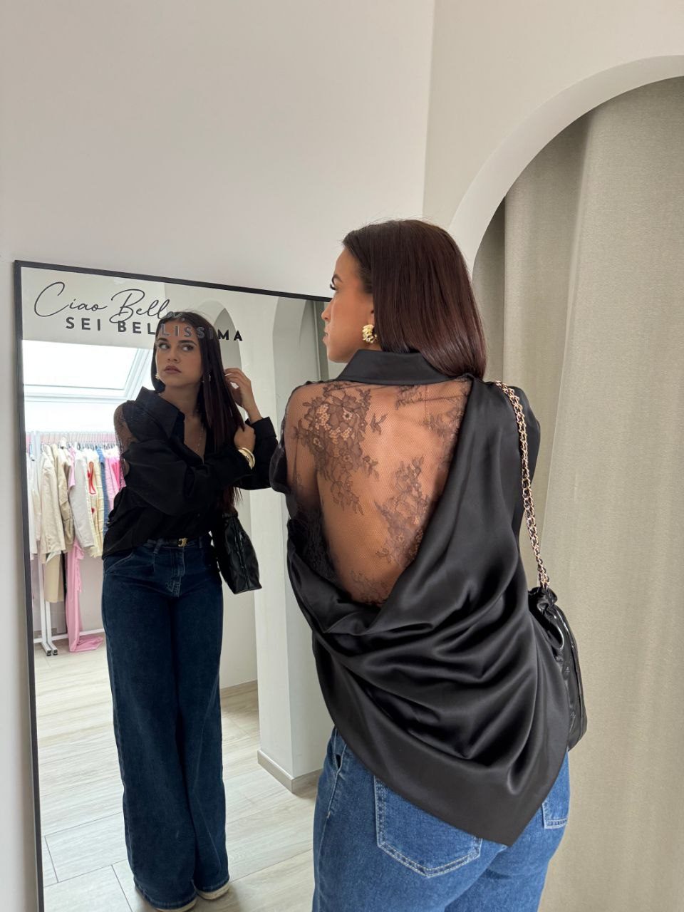Cămașă de damă elegantă, confecționată din satin fin și decorată cu dantelă delicată. Ideală pentru ținute chic de zi sau de seară, această piesă versatilă completează perfect o fustă elegantă sau o pereche de pantaloni clasici.