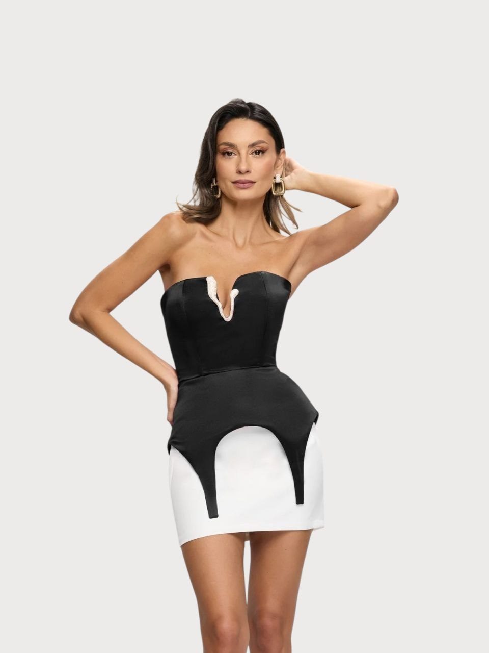 Acest corset are un design modern si indraznet, realizat din tafta.Decolteul este drept, cu un decupaj in forma de V, accentuat de un detaliu decorativ.Linia taliei este foarte bine marcata, iar partea inferioara prezinta prelungiri negre asimetrice, ce coboara peste zona soldurilor.