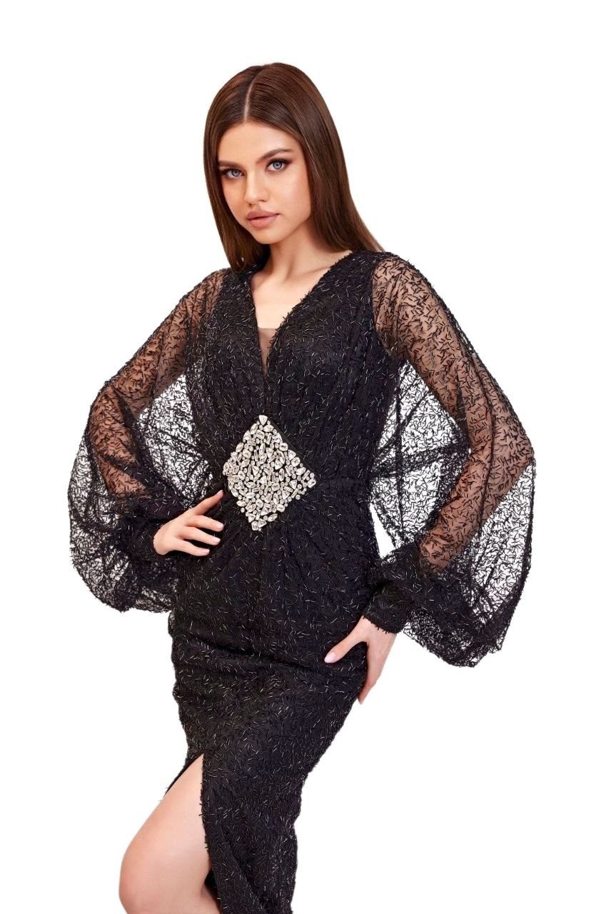 Rochie de ocazie neagră cu strass-uri si paiete, ideala tinutelor rafinate. Croiul deosebit si la moda, va face din aparitia ta, una feminina indiferent de ocazie.