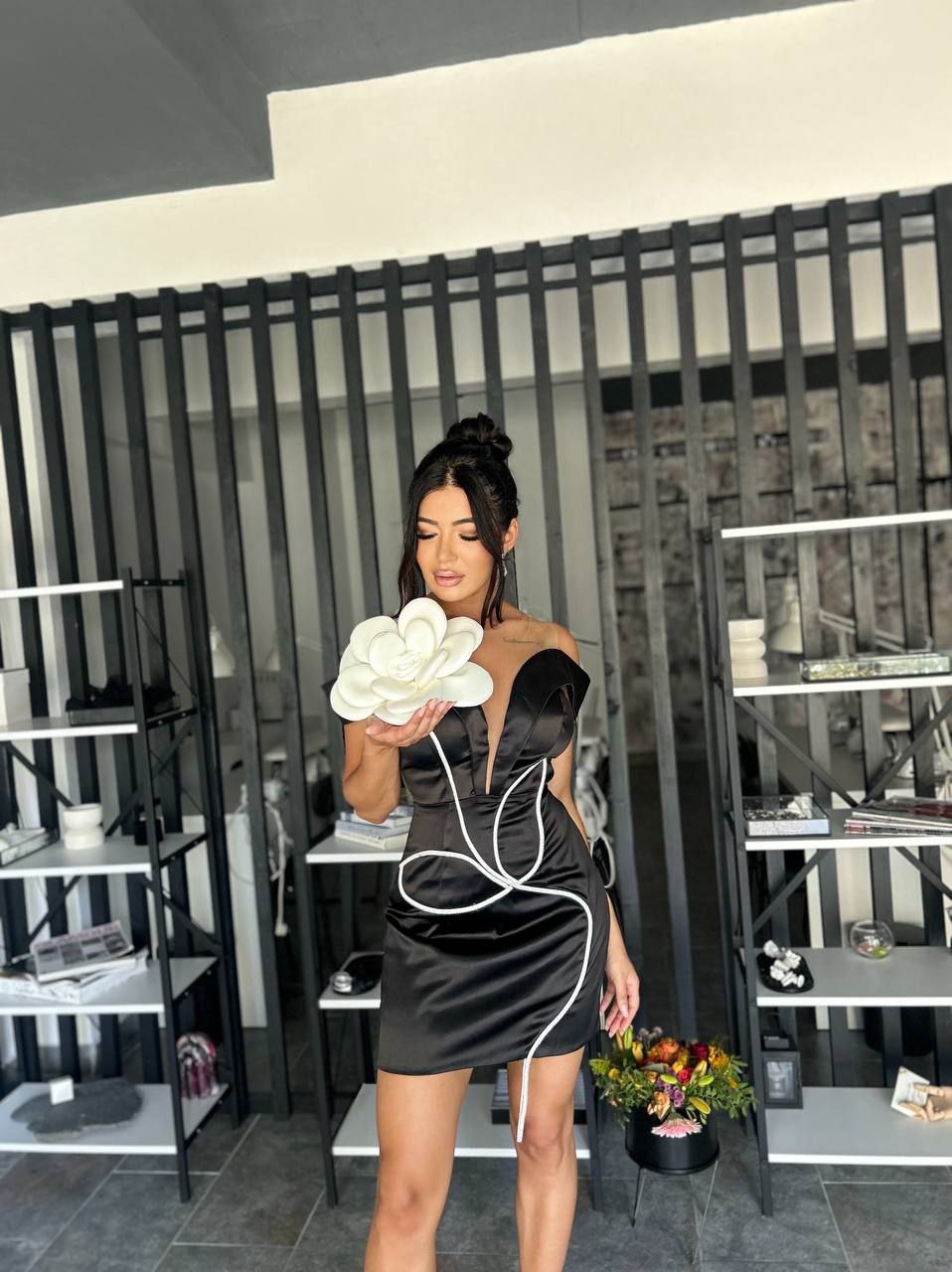 Rochie mini elegantă neagră, accesorizată cu o floare supradimensionată.
