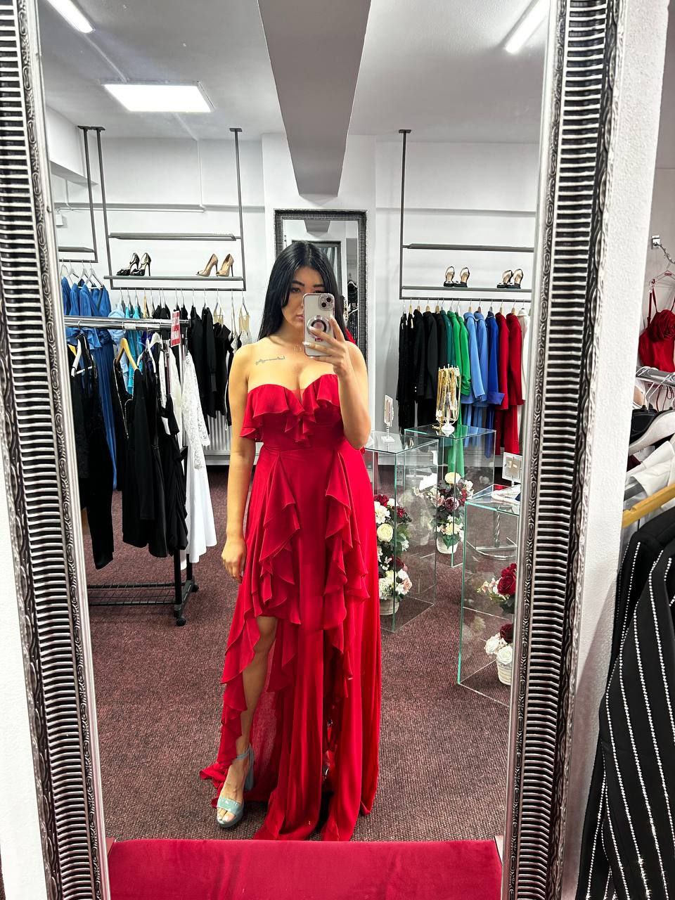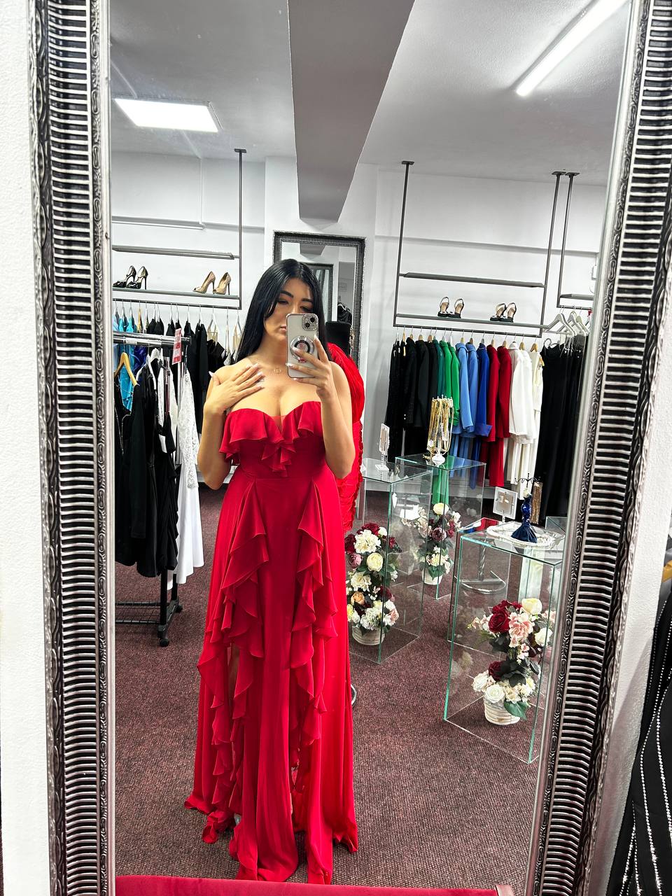 Rochie roșie elegantă cu volane asimetricice Atrage toate privirile cu această rochie spectaculoasă, realizată din material vaporos, într-o nuanță intensă de roșu. Designul pe corest fără bretele pune în valoare linia umerilor, iar volanele delicate adaugă un plus de romantism. Croiala conferă un aer sofisticat și senzual.