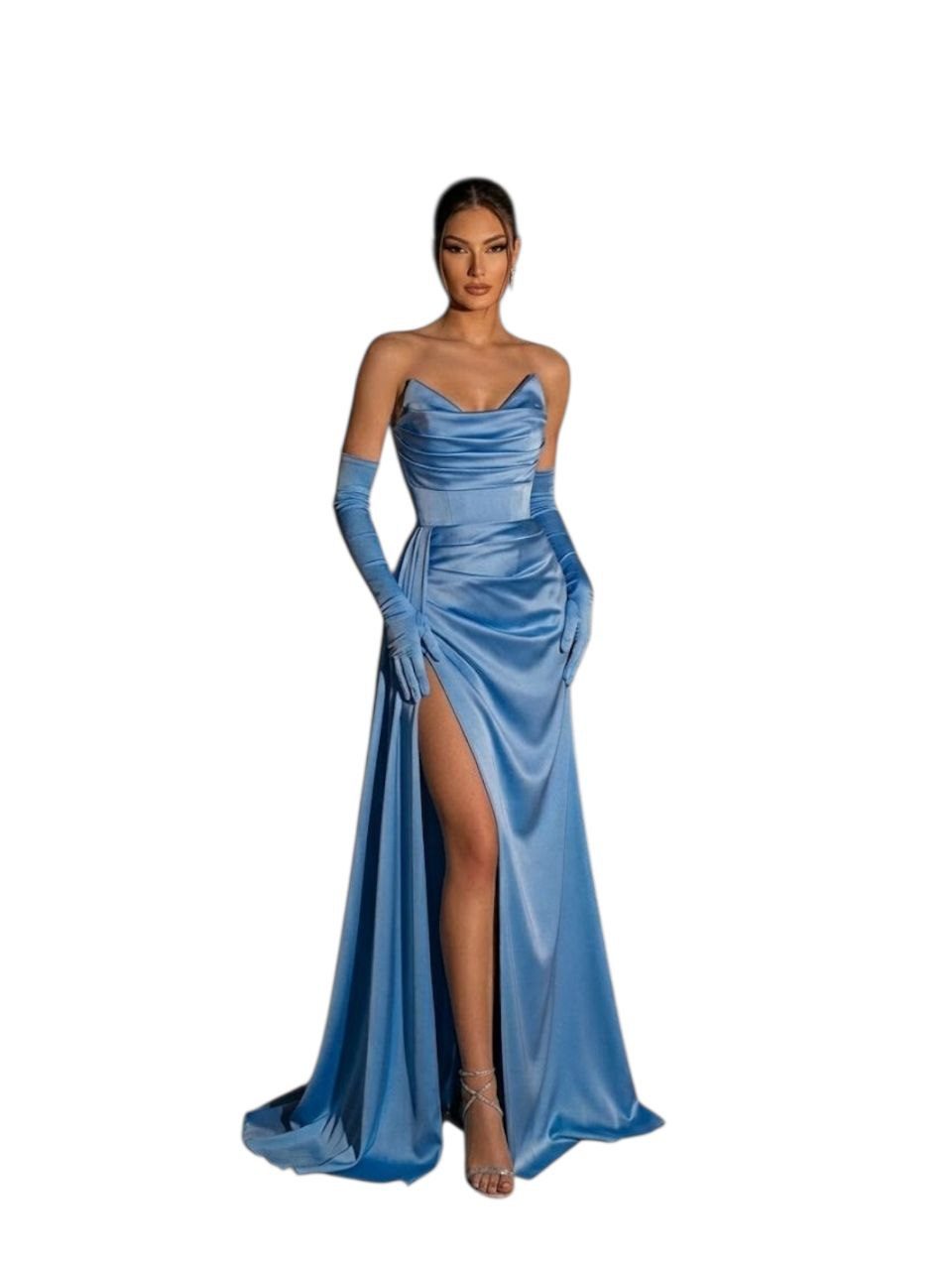 Această rochie lungă și elegantă, în nuanța delicată de Baby Blue, emană rafinament prin simplitatea sa sofisticată. Construită dintr-un satin fin, partea superioară a rochiei este bazată pe un corset care subliniază silueta, oferind un aer senzual și feminin. Designul este completat de trena laterală si o crăpătură adâncă pe picior, adăugând un strop de îndrăzneală și alungind vizual linia corpului.