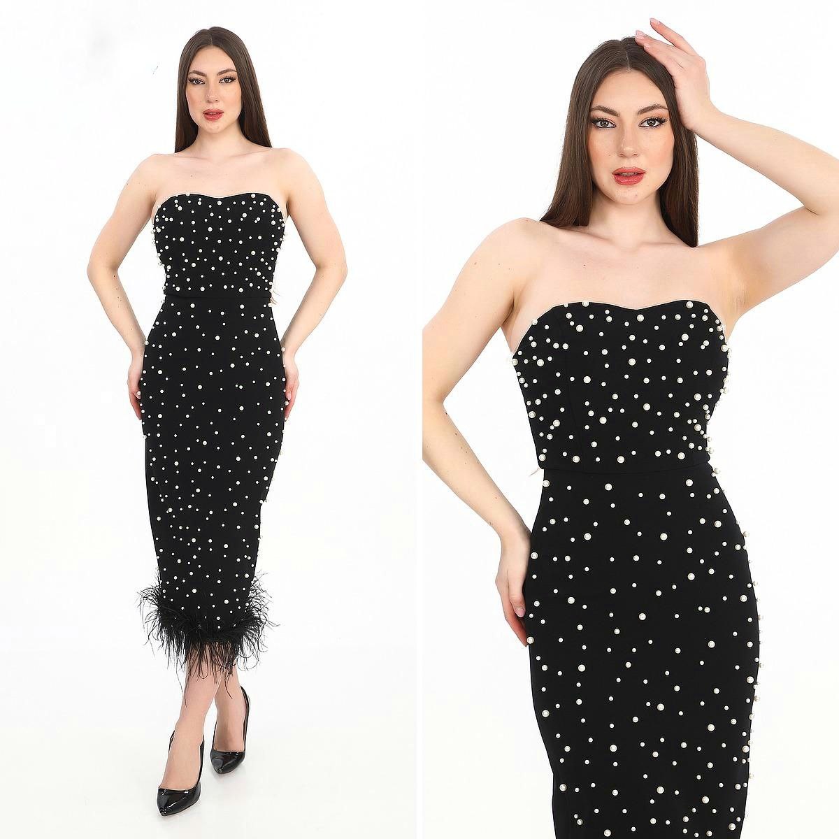 Rochie elegantă neagră, decorată cu perle aplicate manual în partea din față. Partea din spate este simplă, fără perle, pentru un plus de confort. Croială mulată pe corp, accentuată la bază cu pene fine pentru un efect glam.