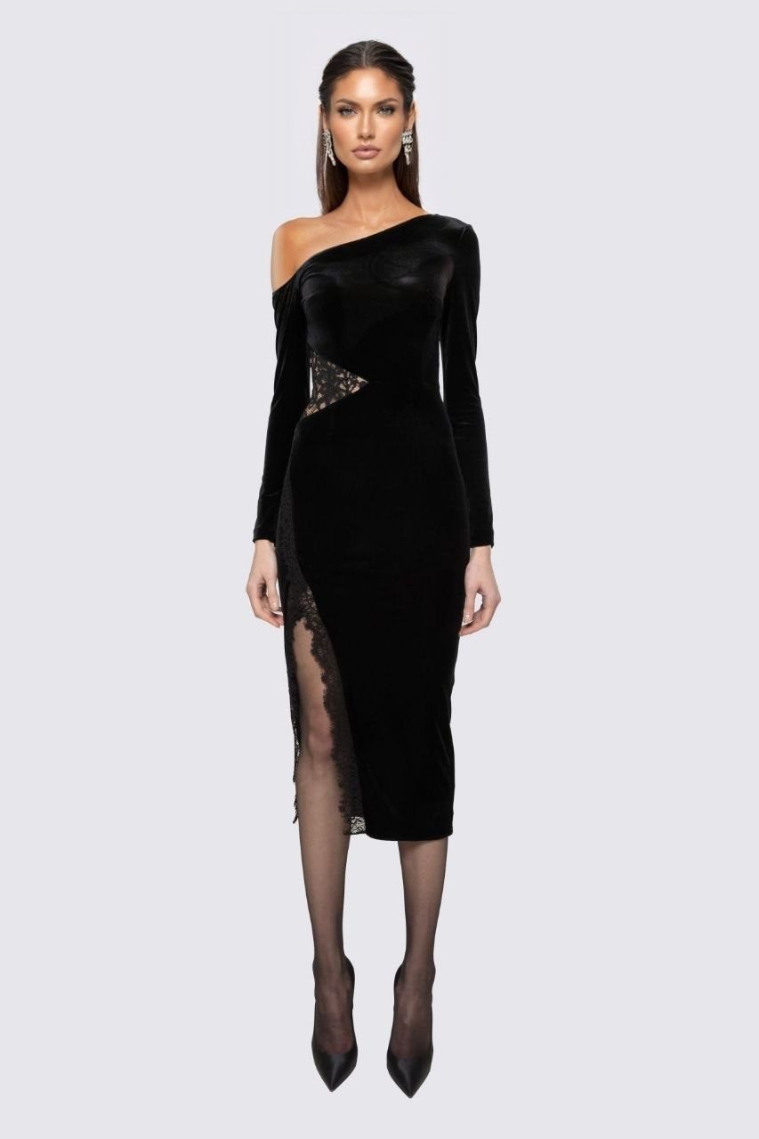 Rochia neagra din catifea eleastica, mulata pe corp, cu lungimea midi, maneca lunga si un umar gol. Este accesorizata cu dantela in zona taliei si pe picior. Slit pe picior si fermoar in lateral.